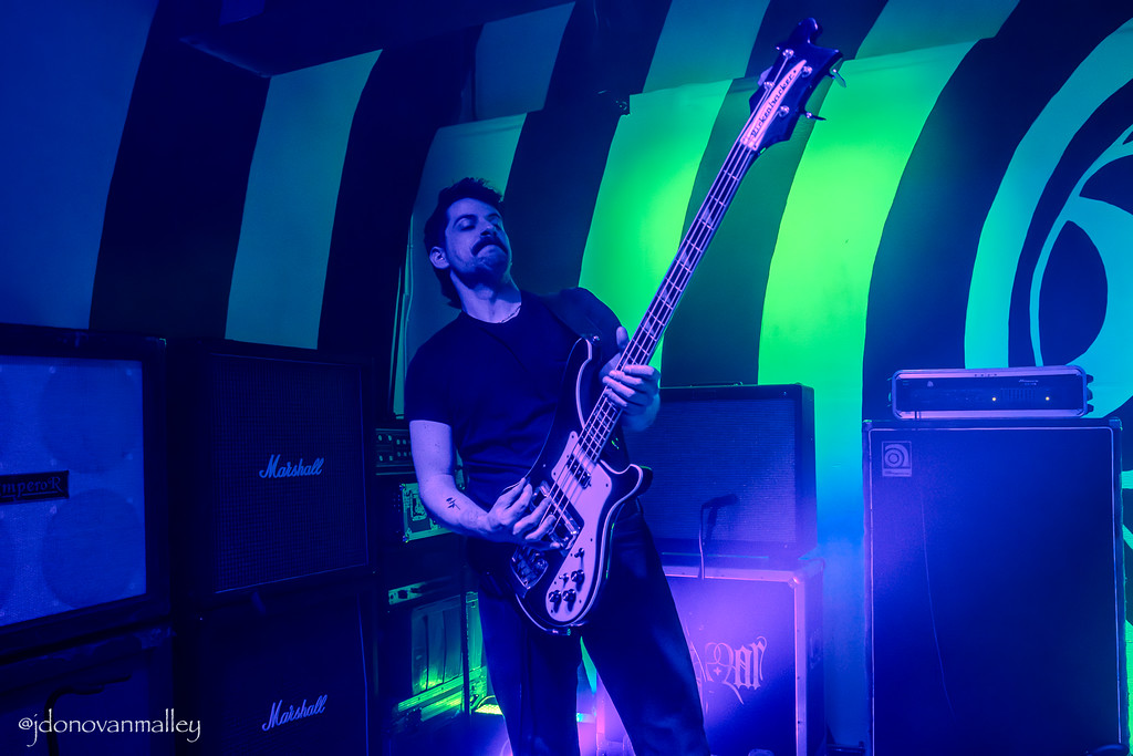 Aequorea displayed a different approach to blending doom with post-metal, providing an intense and extraordinary performance. Their ability to weave clean, melancholic passages with bursts of dissonant heaviness showcased their dynamic range. The pre-party closed with Ninth Moon Black, whose cinematic, instrumental doom enveloped the room. Their atmospheric soundscapes, punctuated by slow-building crescendos and crushing climaxes, created a fully immersive experience made only more powerful by visuals projected on the wall as they played. The crowd’s enthusiasm was palpable, and the band’s finale was a fitting capstone for an unforgettable evening.